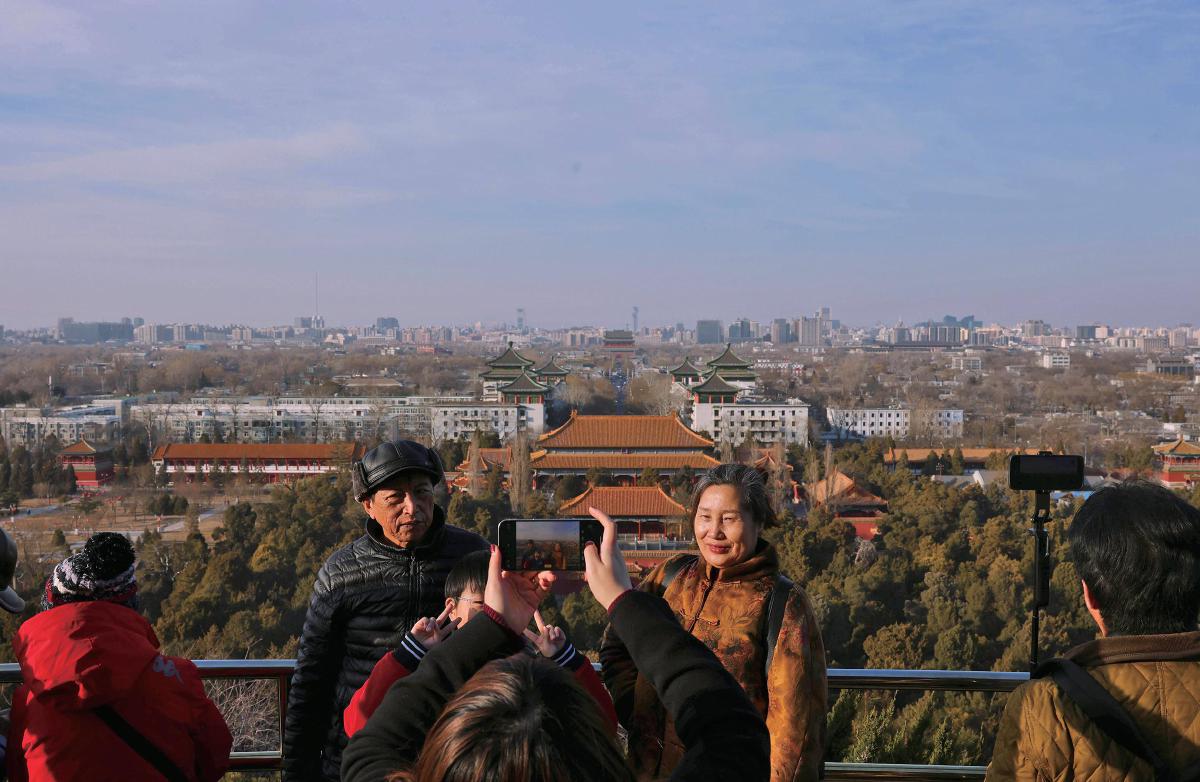 2月24日,景山公园,游客与中轴线合影。